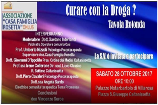 Si svolgerà oggi, sabato 28 ottobre, una tavola rotonda organizzata dall’associazione “Casa Famiglia Rosetta” sul tema “Curare con la Droga”. L’evento, che avverrà alle 10:00 in piazza San Giuseppe presso il Palazzo Duca di Villarosa Notarbartolo, vuole essere un omento di incontro e discussione su temi inerenti all’uso della cannabis per scopi terapeutici. All’assemblea sarà moderata dal Dott. Gaetano Interlandi e interverranno il Prof. Umberto Nizzoli, psicologo e supervisione della Ass Casa di Rosetta, il Dott. Giovanni Ippolito, Presidente dell’ordine dei medici di Caltanissetta, la Prof.ssa Irene Collerone, dirigente scolastica del Liceo Classico R. Settimio, il Dott. Pietro Cavaleri, Psicoterapeuta, la Dott.ssa Angela Sardo, direttrice della comunità terapeutica Terra Promessa, ed infine Don Vincenzo Sorce, che terrà le conclusioni del dibattito.