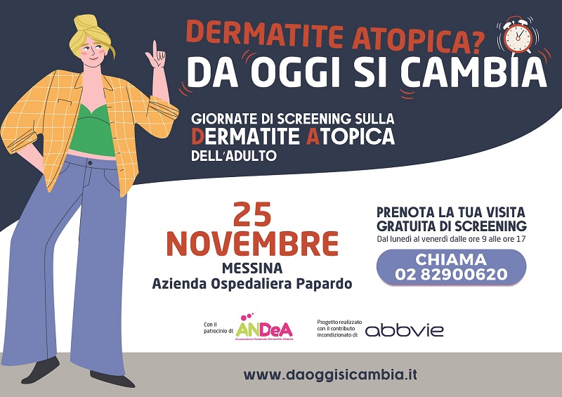 Il 25 novembre, presso l’UOC di Dermatologia dell’Azienda Ospedaliera Papardo, la campagna “Dermatite Atopica? Da oggi si cambia” in collaborazione con ANDeA offre visite gratuite a chi soffre di dermatite atopica. Per prenotazioni, contattare il centralino al numero 02 82900620 dal lunedì al venerdì dalle 9:00 alle 17:00.
