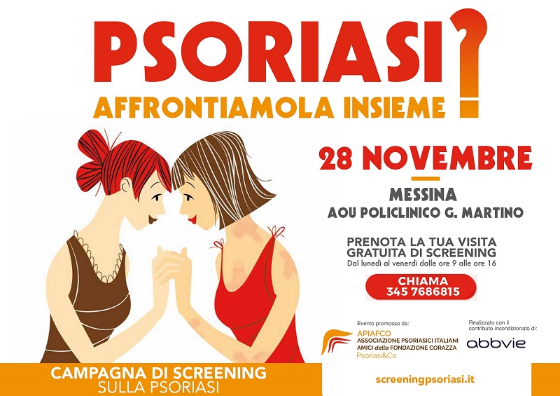Il 28 novembre, presso l’UOC Dermatologia del Policlinico Universitario G. Martino, la campagna “Psoriasi? Affrontiamola insieme” promossa da APIAFCO offre visite dedicate ai pazienti affetti da psoriasi. Per prenotazioni, contattare il numero 345 7686815 dal lunedì al venerdì dalle 9:00 alle 16:00.