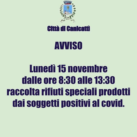 L’amministrazione comunale di Canicattì, infroma che domani, lunedì 15 novembre, sarà effettuata la raccolta di rifiuti speciali prodotti dai soggetti positivi al covid. L’inizio delle attività è previsto dalle 8:30 con conclusione alle 13:30.
