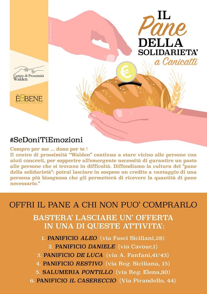 Diffondiamo la cultura del ” ̀”: potrai lasciare in sospeso, presso uno degli esercizi aderenti, un credito a vantaggio di una persona più bisognosa che gli permetterà di ricevere la quantità di pane necessario.
