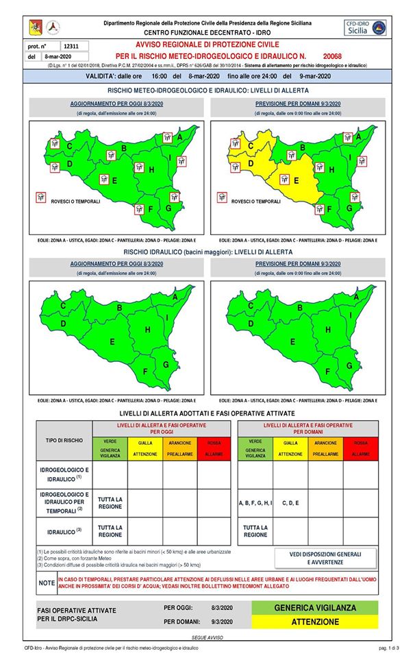 Il sindaco di Canicattì, Ettore Di Ventura, informa i cittadini che il Dipartimento Regionale della Protezione Civile ha diramato per oggi, lunedì 9 marzo, fino alle 24, l’avviso di condizioni meteo avverse con livello di attenzione “Gialla” con rovesci e temporali.