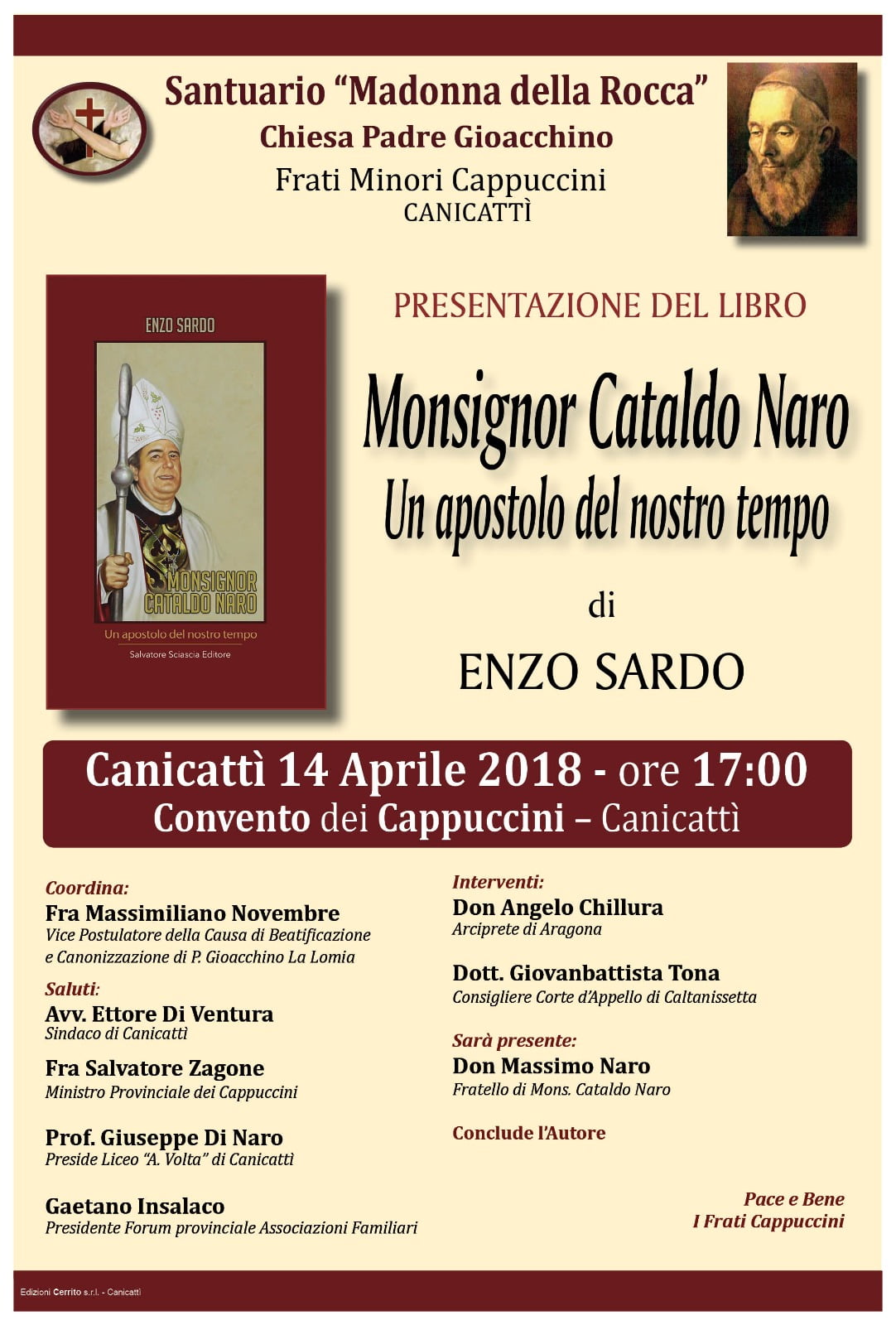Sarà presentato oggi pomeriggio alle 17.00 presso il santuario dei frati cappuccini Madonna della Rocca (chiesa di Padre Gioacchino La Lomia) a Canicattì, il nuovo libro di Enzo Sardo dal titolo : “Monsignor Cataldo Naro, un apostolo del nostro tempo”. La cerimonia inizierà con i saluti: del sindaco di Canicattì, Ettore Di Ventura, Fra Salvatore Zagone ministro provinciale dei Cappuccini, prof. Giuseppe Di Naro preside del liceo Volta di Canicattì e di Gaetano Insalaco , presidente forum provinciale associazioni familiari Coordinerà l’evento Fra Massimiliano Novembre, vice postulatore della causa di beatificazione e canonizzazione di padre Gioacchino La Lomia. Sono previsti gli interventi di: Don Angelo Chillura ,Arciprete di Aragona e Don Giovanbattista Tona, Consigliere Corte D’Appello di Caltanissetta. Sarà presente Don Massimo Naro , fratello di Mons. Cataldo Naro. La cerimonia sarà conclusa con un intervento di Enzo Sardo, autore del libro.