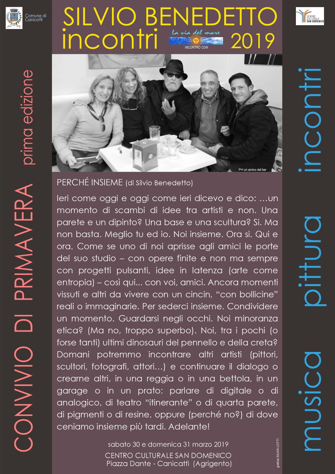 Alle 19:00 di sabato 30 marzo, nella “Sala Mostre”del Centro Culturale San Domenico, in Piazza Dante a Canicattì, avrà inizio la 1° edizione del “Convivio di primavera”, una manifestazione culturale a carattere continuativo con ricorrenza annuale ideata per celebrare le arti visive, la musica, gli incontri.