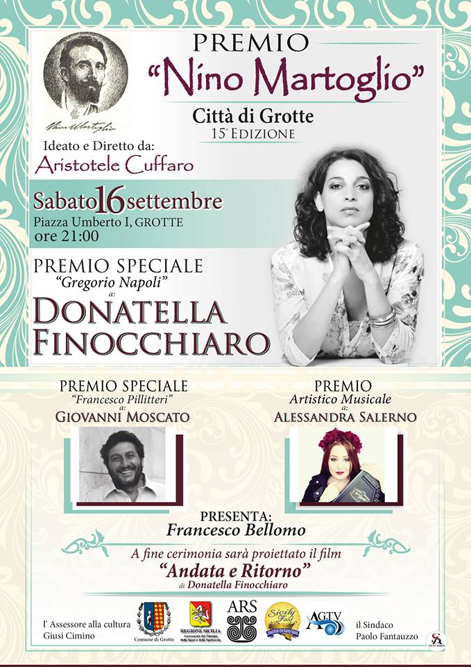É giunto alla 15 edizione il Premio “Nino Martoglio” Città di Grotte, ideato e diretto da Aristotele Cuffaro, che si terrà sabato 16 settembre in Piazza Umberto I, con inizio alle ore 21.00. Nel corso della manifestazione, presentata da Francesco Bellomo, saranno conferiti tre Premi Speciali: – Premio Speciale “Gregorio Napoli” all’attrice Donatella Finocchiaro; – Premio Speciale “Francesco Pillitteri” a Giovanni Moscato; – Premio Artistico-Musicale ad Alessandra Salerno. La proiezione del film “Andata e Ritorno” di Donatella Finocchiaro concluderà la serata. Donatella Finocchiaro è attrice e regista. Con la sua interpretazione come protagonista del film “Angela” di Roberta Torre nel 2002 diviene nota al grande pubblico (per quel film vincerà nel 2003 il Globo d’oro come “Miglior attrice rivelazione”). Nel 2006 vince il Globo d’Oro come “Miglior attrice rivelazione” per il film “Il regista di matrimoni” di Marco Bellocchio. Nel corso della sua carriera ha lavorato con registi come Roberto Andò, Giuseppe Tornatore, Mimmo Calopresti, Edoardo Winspeare, Emanuele Crialese e Pupi Avati. In teatro è stata diretta, tra gli altri, da Luca Ronconi, Gigi Dall’Aglio, Ninni Bruschetta, Giampiero Cicciò, Andrea De Rosa. Ha esordito alla regia nel 2011 con il documentario “Andata e Ritorno”, presentato alla 68^ Mostra Internazionale d’Arte Cinematografica di Venezia nella sezione Controcampo Italiano. In teatro, sempre nel 2011, ha interpretato per la Rai il ruolo di Maria in “Questi fantasmi!” di Eduardo De Filippo. Ha esordisce in televisione nel 2013, nella trasmissione di Rai 1 “Riusciranno i nostri eroi”, al fianco di Max Giusti, Laura Chiatti e Cristiano Malgioglio. Nel 2015 è stata in scena con “Le supplici” di Eschilo al teatro greco di Siracusa con la regia di Moni Ovadia e Mario Incudine. Giovanni Moscato è un autore, attore, cantautore, produttore discografico e conduttore televisivo. È fondatore e direttore artistico del Teatro della Posta Vecchia di Agrigento. Tra le sue esperienze: la conduzione di un programma in tre puntate della Rai per la TV dei ragazzi dal titolo: “I paladini di Francia” registrato a Cinecittà, per la regia di Ugo La Rosa; la collaborazione con Pippo Flora nel musical “Caino e Abele” si Tony Cucchiara. Più recente la sua partecipazione nel film “La Scomparsa di Patò” di Rocco Mortelliti tratto dall’omonimo libro di Andrea Camilleri. Alessandra Salerno è una giovane cantante palermitana, componente nel 2015 del “Team Pelù” nel programma “The Voice of Italy” su Rai 2. Interprete soul swing, come strumento musicale suona l’autoharp.. Prosegue così, con la 15^ edizione del Premio “Nino Martoglio” Città di Grotte, la galleria di grandi artisti siciliani che hanno ricevuto questo riconoscimento.