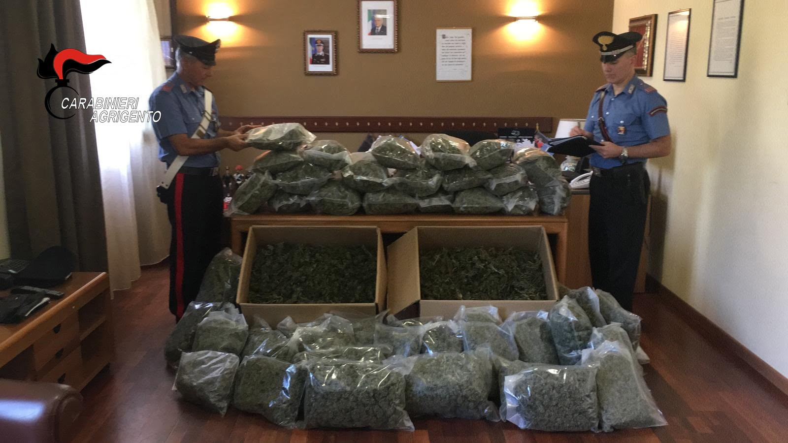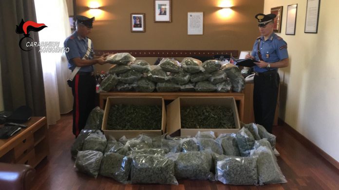 I Carabinieri del Comando Provinciale di Agrigento hanno scoperto una vasta piantagione di “Marijuana” nelle campagne di Naro, paese dell’entroterra agrigentino. Il blitz è scattato in nottata, con l’irruzione di una trentina di militari in un fondo agricolo. Sequestrate oltre 30 tonnellate di “Marijuana”, in parte già essiccata, confezionata e pronta ad invadere le piazze dello spaccio dell’isola, in parte in fase di maturazione su oltre diecimila piante di “Canapa indiana” nascoste tra gli alberi di cachi. Si tratta di uno dei più ingenti quantitativi di stupefacente mai rinvenuto in un solo colpo in Sicilia. In manette tre complici, trovati in possesso anche di una pistola. Oltre quindici milioni di euro il valore al dettaglio della sostanza stupefacente sequestrata. Il sorvolo di un drone sulla piantagione sospetta ha confermato l’intuizione dei militari. I Carabinieri della Compagnia di Licata (Ag), che da circa un mese avevano notato delle strane coltivazioni in un appezzamento di terreno ubicato nel territorio comunale di Naro (Ag), insospettiti dalla situazione, hanno cinturato l’area in questione, facendo irruzione nel fondo agricolo, dove sono stati subito rintracciati tre insospettabili individui, tra cui un insospettabile dipendente comunale. Poco dopo aver iniziato la perquisizione, i sospetti si sono rivelati fondati: in un casolare, adibito ad essiccatoio terminale nel processo di complessa lavorazione dello stupefacente, sono saltati fuori decine e decine di sacchi già confezionati, contenenti “Marijuana” già essiccata, pronta per essere smerciata, per un peso complessivo di oltre 135 chili. Fatto accesso in un secondo essiccatoio, tappa intermedia nel processo, quasi scientifico, di lavorazione della canapa indiana, i Carabinieri non hanno potuto credere ai loro iocchi. Per terra e su reticolati metallici a più strati, i militari hanno trovato una impressionante distesa di “maria” in fase di essiccazione. Da una prima pesatura speditiva, risulta, su questo secondo sito, oltre una tonnellata di stupefacente. A questo punto, le ricerche dei Carabinieri, con l’ausilio anche delle unità cinofile , si è spinto fino alla campagna circostane, dove, durante la successiva meticolosa ispezione in un attiguo fondo agricolo, nascosta tra i filari di una coltivazione di alberi di cachi, i Carabinieri hanno scovato una ulteriore mega piantagione di “Canapa indiana”, costituta da altre 10.000 piante, alte qausi due metri. Durante le operazioni di perquisizione, è saltata fuori anche una Pistola da guerra calibro nove in ottimo stato di efficienza ed oltre 50 cartucce dello stesso calibro, risultate illegalmente detenute e nella disponibilità del dipendente comunale. Su questa sono in corso gli esami balistici del RIS allo scopo di verificare il suo eventuale uso in recenti fatti di sangue verificatisi nella provincia di agrigento. Al termine delle prolungate attività di estirpazione delle piante, ancora in corso con pale meccaniche e mezzi pesanti, sono così state complessivamente sequestrate altre trenta tonnellate di “Marijuana”. Per i tre individui, sono subito scattate le manette ai polsi con l’accusa di “Coltivazione e Detenzione ai fini di spaccio di sostanze stupefacenti” e, per il dipendente comunale, anche di “Illegale detenzione di arma da guerra”. Per i tre si sono aperte le porte del carcere. Si stima che l’enorme quantitativo di droga sequestrato, che avrebbe invaso le piazze della movida dell’intera provincia di Agrigento e di tutta l’isola, avrebbe potuto fruttare ben oltre i quindici milioni di euro.
