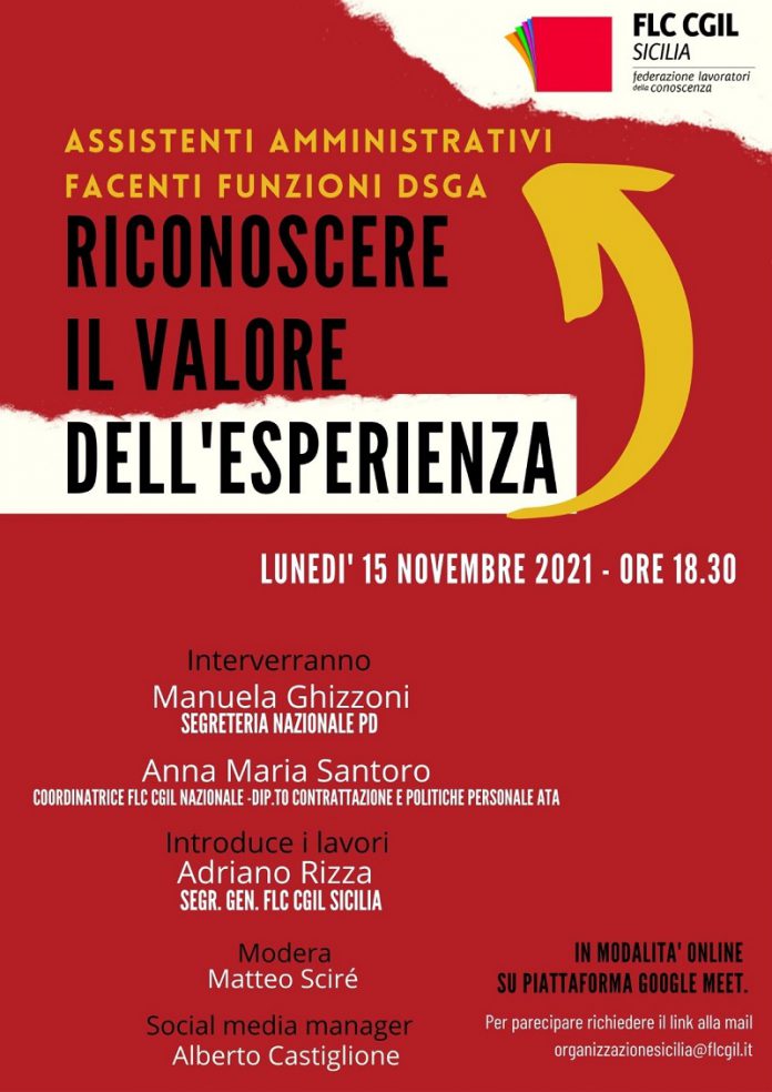 Si terrà lunedì 15 novembre, alle ore 18.30, sulla piattaforma Google Meet, il webinar “Assistenti amministrativi facenti funzioni Dsga, riconoscere il valore dell’esperienza”. All’evento, organizzata dalla Flc Cgil Sicilia, interverranno Manuela Ghizzoni, responsabile scuola università e ricerca del Partito democratico, e Anna Maria Santoro, coordinatrice del Dipartimento contrattazione e politiche personale Ata della Flc Cgil nazionale.