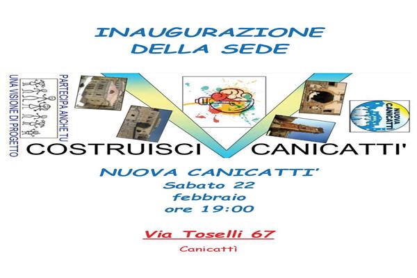 Sabato 22 febbraio alle ore 19:00 si svolgerà l’inaugurazione della sede del movimento Nuova Canicattì sita a Canicattì in Via Toselli ( in prossimità della stazione ferroviaria ) .