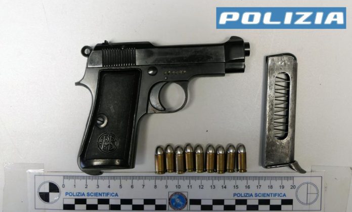 Durante la perquisizione grazie al fiuto infallibile di Iocco, un Labrador dal manto nero, i poliziotti hanno rinvenuto una pistola Beretta calibro 7,65 con matricola abrasa e con caricatore rifornito di cartucce, perfettamente funzionante e pronta per essere utilizzata.